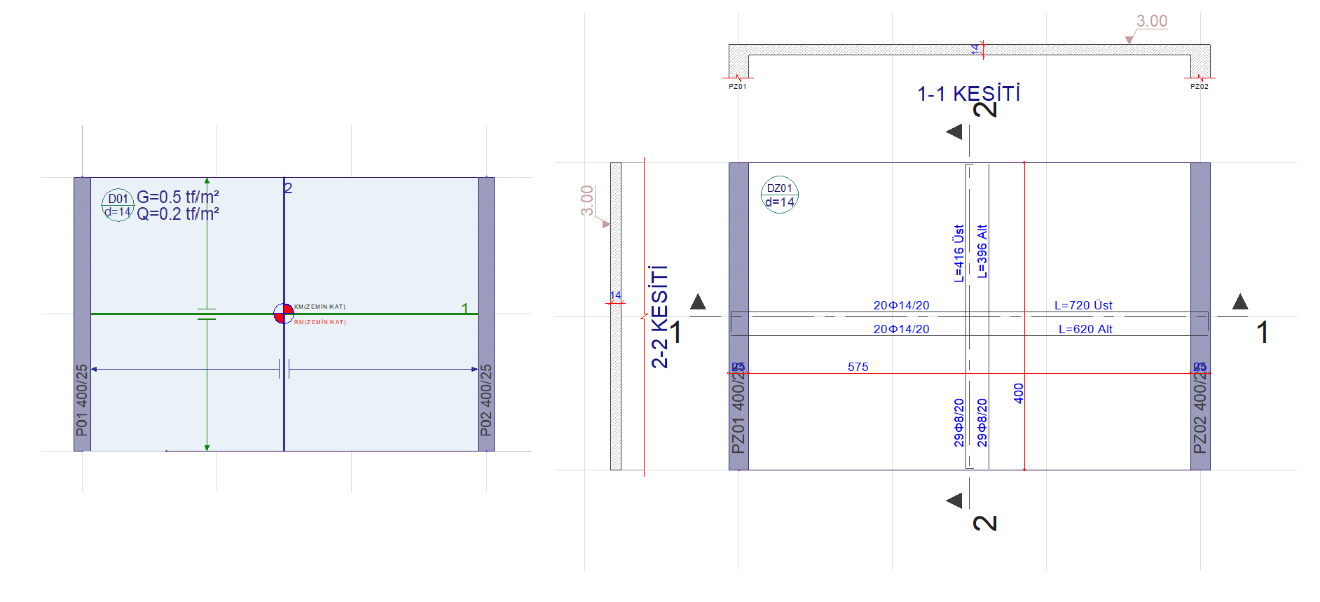 Örnek projede D01 döşemesinde TBDY Madde 7.11.3 'te belirtilen koşullara göre döşeme düzlem içi basınç, çekme ve kayma gerilmesi kontrolü yapılacaktır.