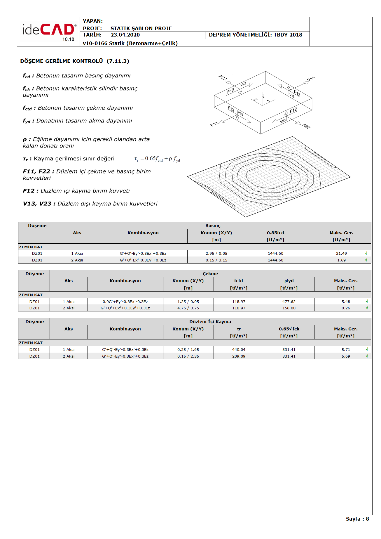 Düzlem içi kayma gerilmesi değeri 5.78 tf/m2 < 435.72 tf/m2 ve 5.78 tf/m2 < 331.41 tf/m2 olduğundan koşul sağlanmıştır.