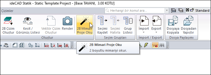 2B Mimari Proje Oku komutuyla, dxf/dwg olarak kayıt edilmiş iki boyutlu çizimler ideCAD objelerine dönüştürülür. Aks, kolon, kiriş, duvar ve perde gibi çizimler kendi katmanlarında çizili olmalıdır. Seçilen katmanlarda yer alan çizimler, objelere dönüştürülür.