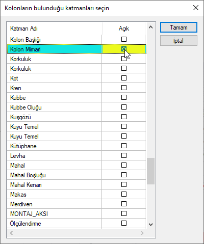 Açılan pencereden dönüştürmek istenilen çizim katmanının -kolon- katmanının seçilmesi ![]() |