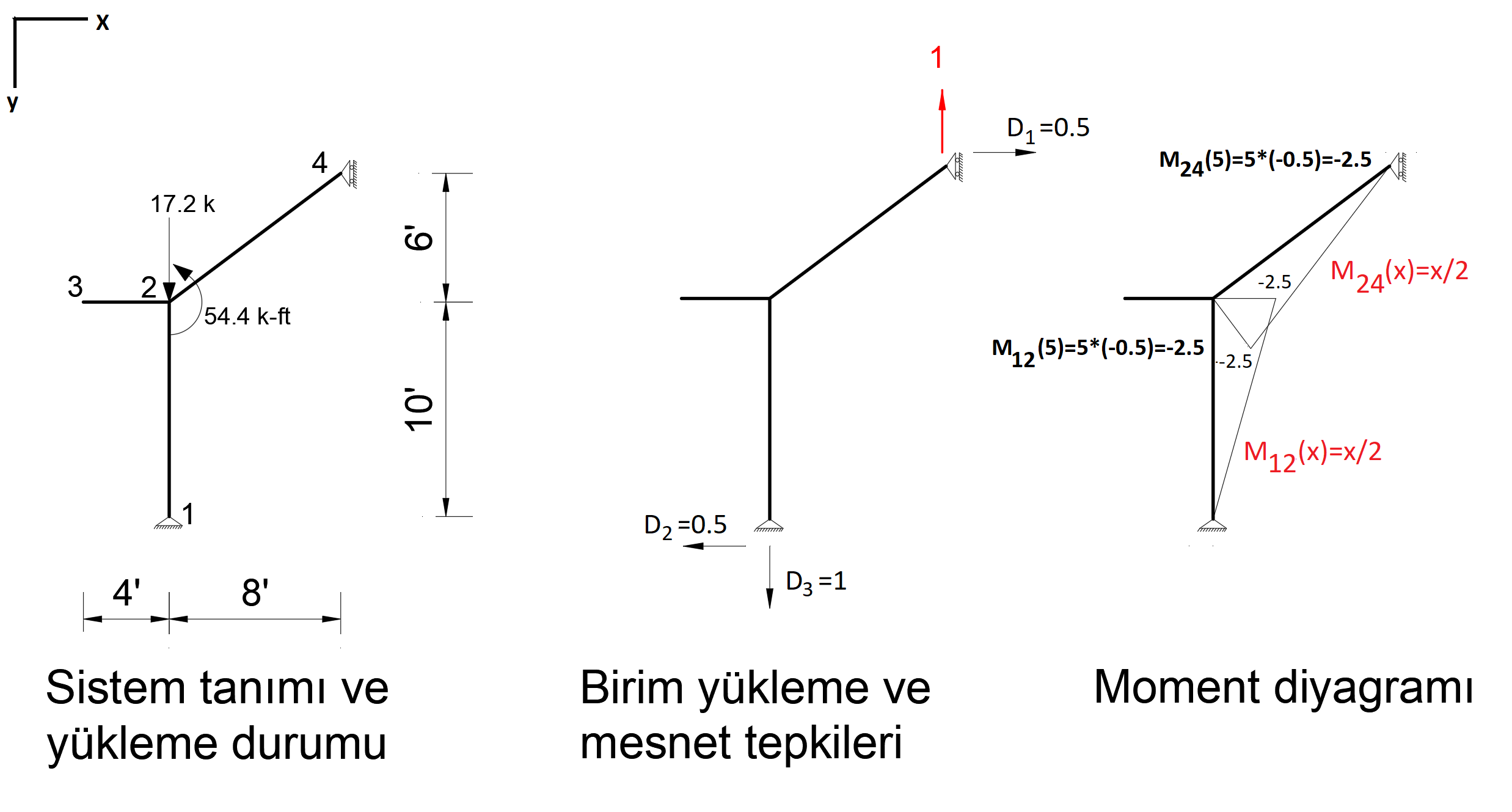1: Birim yükleme D1, D2, D3: Mesnet tepkileri M12: 1-2 çubuğu 2 D.N moment değeri M24: 2-4 çubuğu 2 D.N moment değeri L12: 1-2 çubuğu boyu L24: 2-4 çubuğu boyu M12(x): 1-2 çubuğu Moment fonksiyonu M24(x): 2-4 çubuğu Moment fonksiyonu ΣM1,dn: 1 D.N göre toplam moment ΣM4,dn: 4 D.N göre toplam moment ΣD: Toplam denge