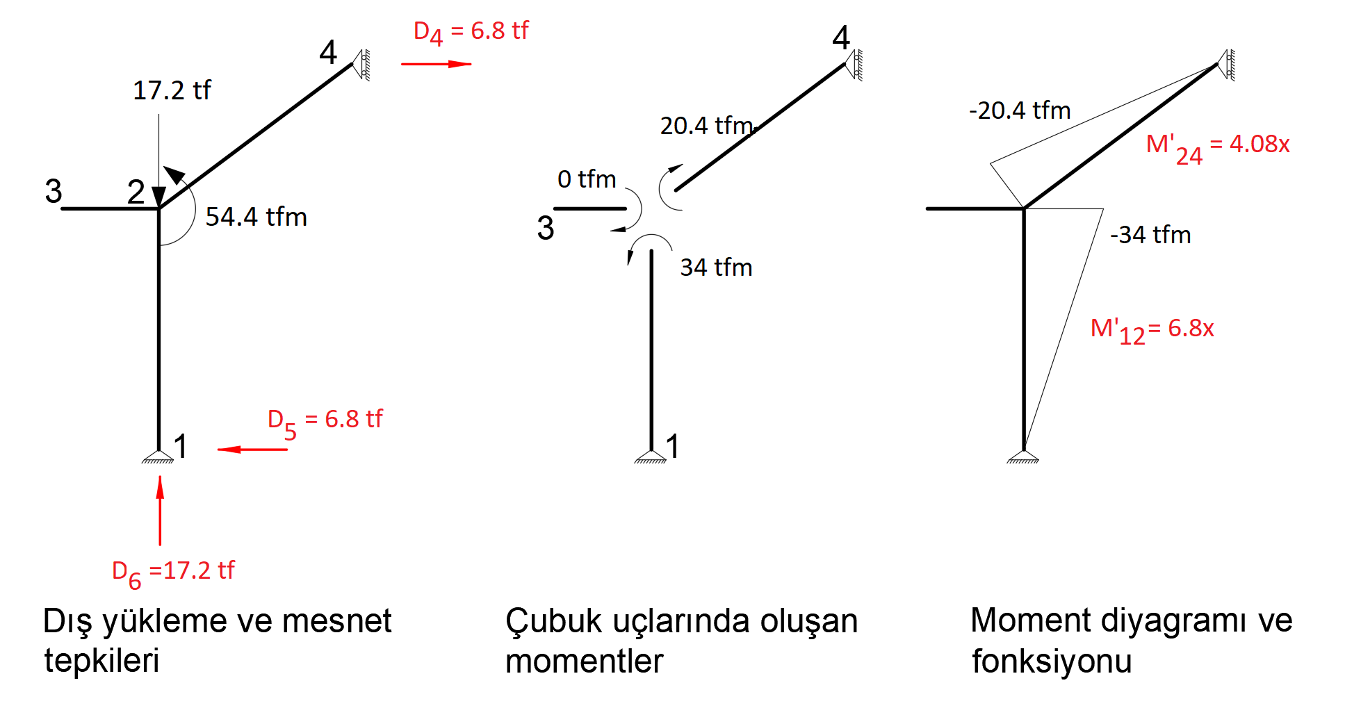 D4, D5, D6: Mesnet tepkileri M'12: 1-2 çubuğu 2 D.N moment değeri M'24: 2-4 çubuğu 2 D.N moment değeri L12: 1-2 çubuğu boyu L24: 2-4 çubuğu boyu M'12(x): 1-2 çubuğu Moment fonksiyonu M'24(x): 2-4 çubuğu Moment fonksiyonu ΣM1,dn: 1 D.N göre toplam moment ΣM4,dn: 4 D.N göre toplam moment ΣD: Toplam denge