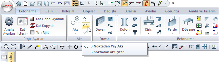3 noktadan yay aks komutuyla, aksın başlangıç ve bitiş noktaları belirlendikten sonra üçüncü noktası belirlenerek yay aksı oluşturulur. Oluşturma işlemi esnasında ekrandan yay aksın öngörüntüsü takip edilir.