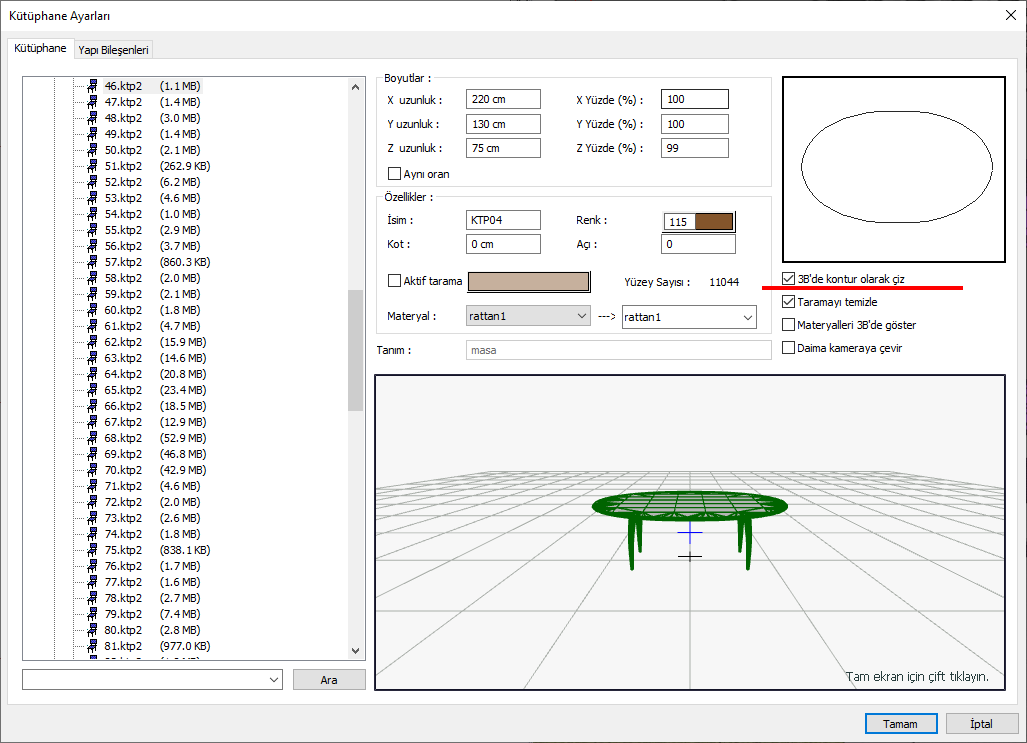 Kütüphane 3 boyutlu modelde sadece kontur olarak gösterilecektir.