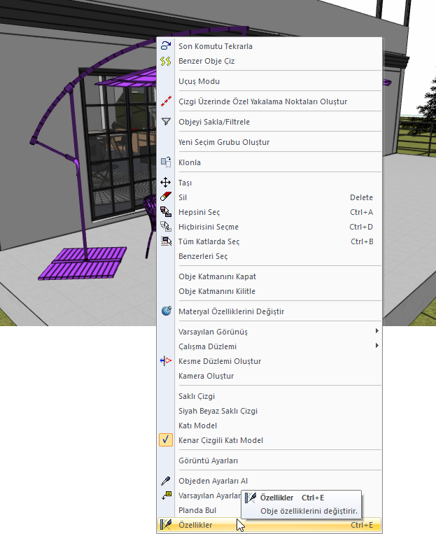 3 boyutlu modelde kontur olarak göstermek istediğiniz objeyi seçin ve farenin sağ tuşuna tıklayarak açılan menüden Özellikler satırına tıklayın.