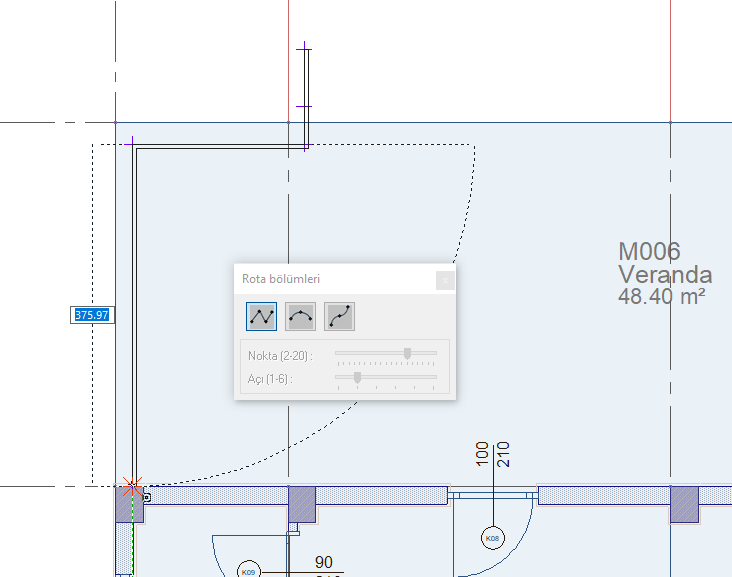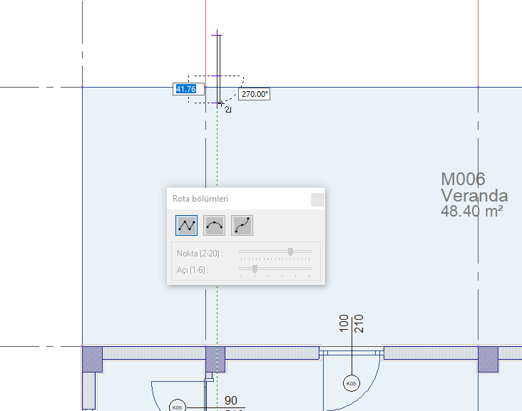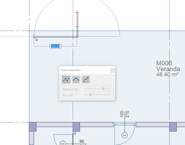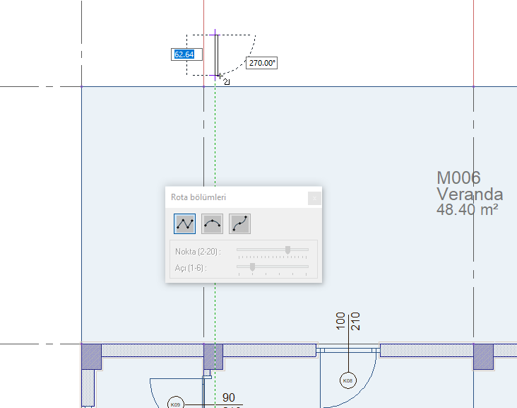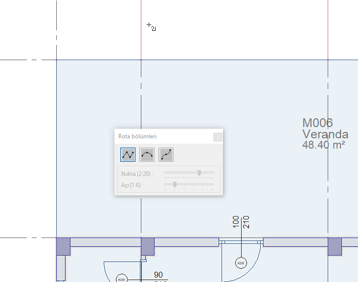 Rota Bölümleri toolbarında korkuluk hattını düz, dairesel ve eğri formda çizmeyi sağlayan ikonlar bulunur.