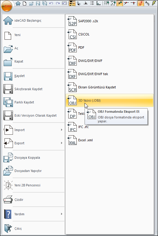 Açılan menüden Export/ 3D Yazıcı (.OBJ) satırını tıklanır.