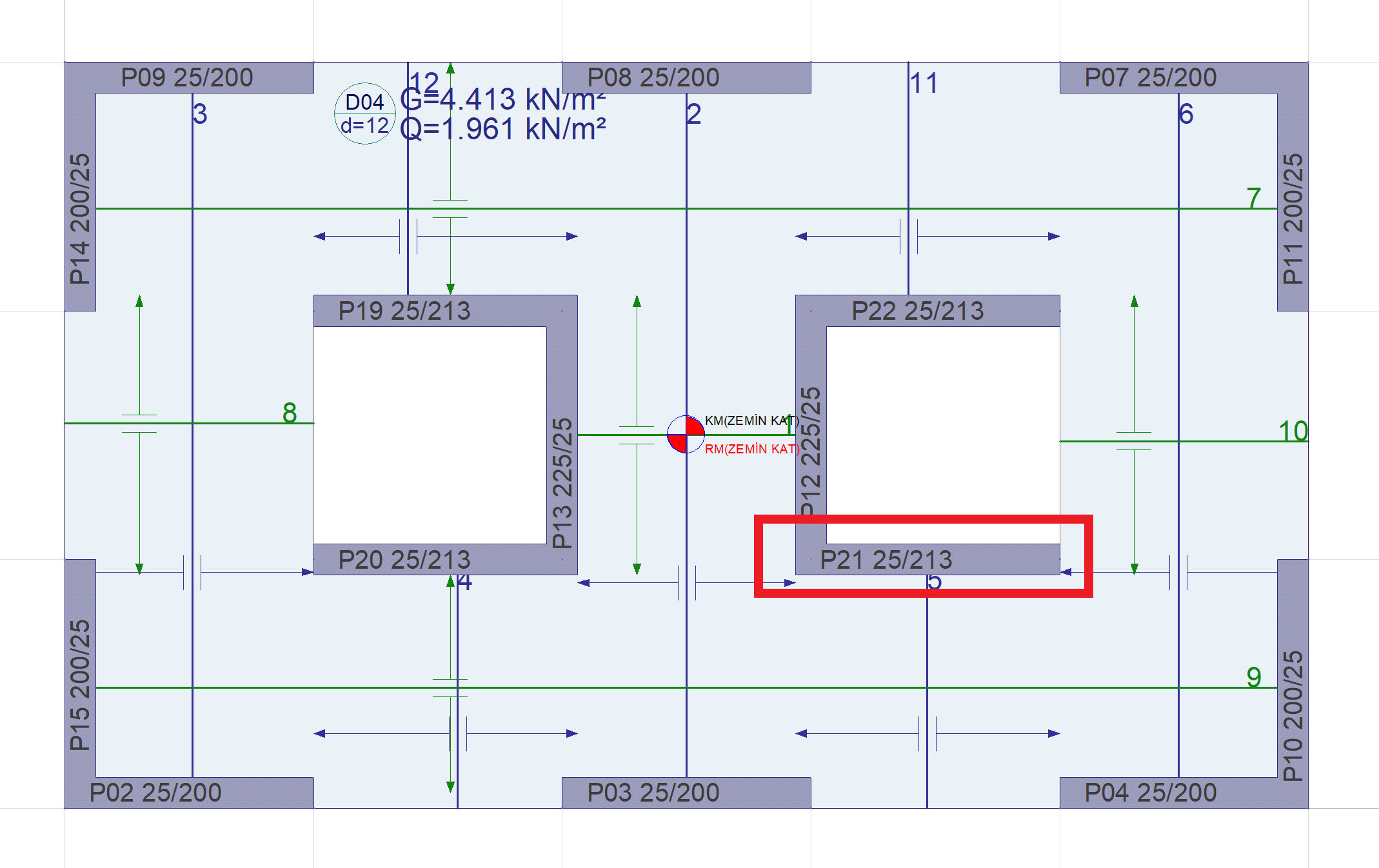 Örnek projede deprem yüklerinin döşemeden Zemin Katta bulunan P21 perde koluna kuvvetli doğrultuda aktarılacak deprem kuvveti hesaplanacaktır. G'+Q'+Ex'-0.3Ey'+0.3Ez yük birleşimi etkisi altında hesap gösterilecektir.