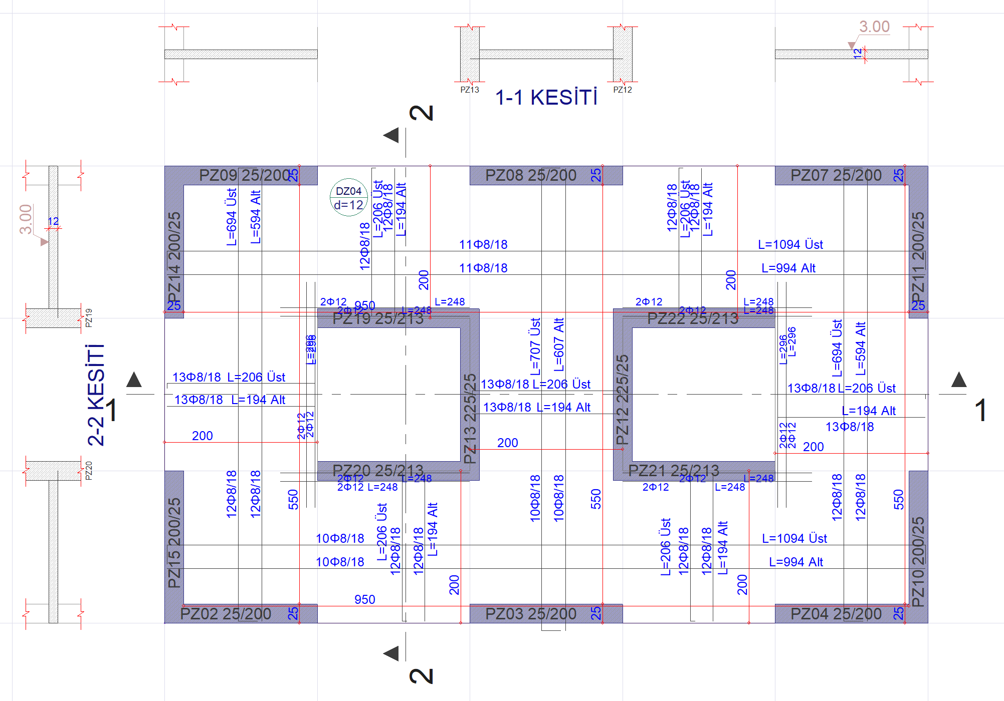 Bu durumda 25 cm kalınlığında PZ21 perdesine saplanan ve eğilme dayanımı için gerekli olandan arta kalan donatı alanı;