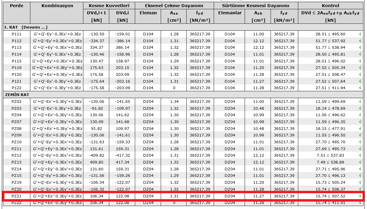 Zemin Kat P21 perde kolunun üst ucunda; G'+Q'+Ex'-0.3Ey'+0.3Ez yük birleşimi etkisi altında düşey yükler ve Dayanım Fazlalığı Katsayısı D gözönüne alınarak hesaplanan deprem yüklerinin ortak etkisi altında hesaplanan kesme kuvveti DVd,i = 122.08 kN olarak hesaplanmıştır.