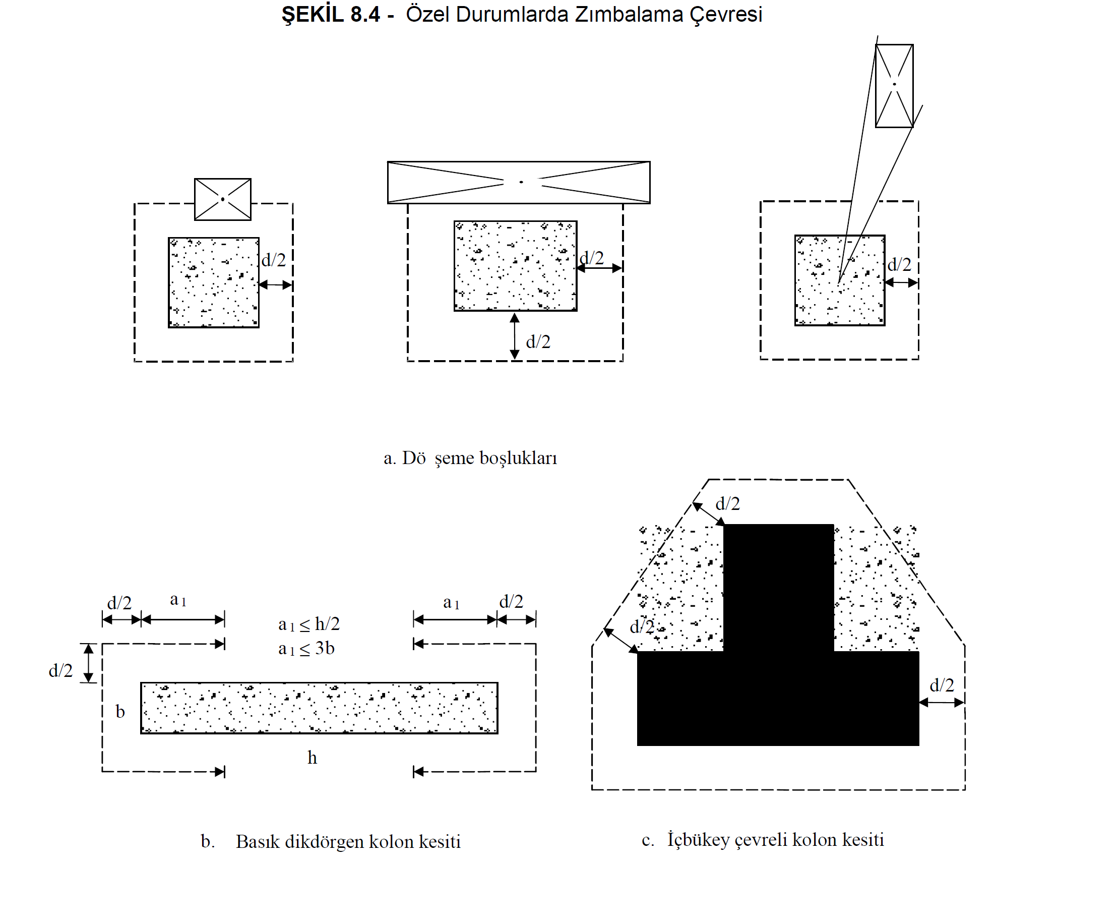 Yükleme alanı çevresinin içbükey olduğu durumlarda (poligon kolonlarda), teğetler ile içbükeyliğin giderilmesinden sonra elde edilen çevre, hesaplarda zımbalama çevresi olarak kullanılmalıdır, Şekil 8.4c.
