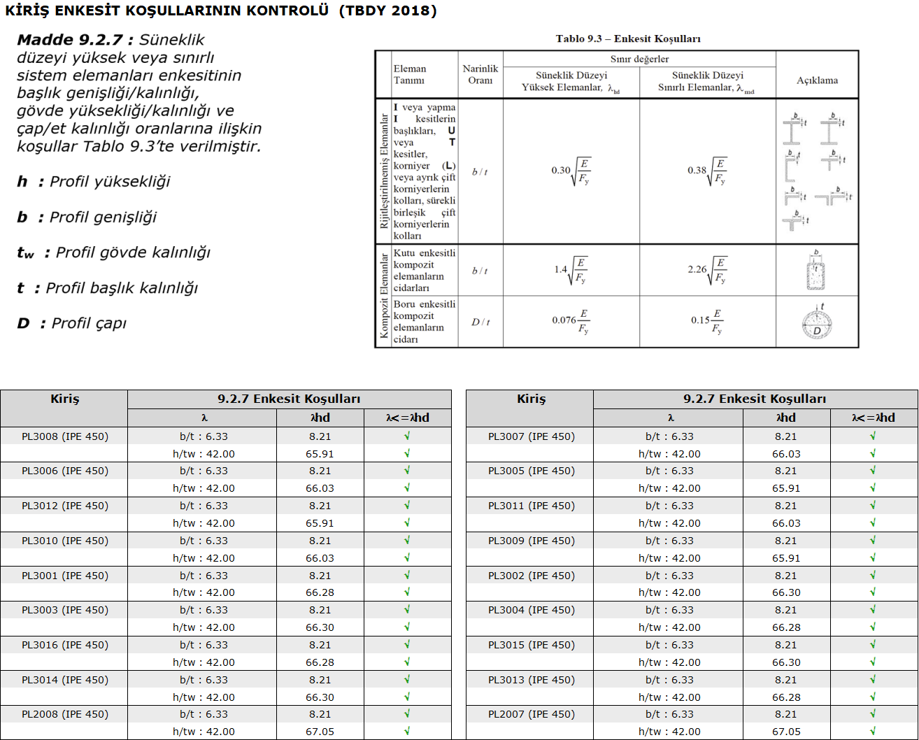 Süneklik düzeyi yüksek moment aktaran çerçeve elemanı olan çelik kolon ve kirişlerin enkesitleri Tablo 9.3’e göre kontrol edilir ve ilgili eleman raporlarında yer alır.