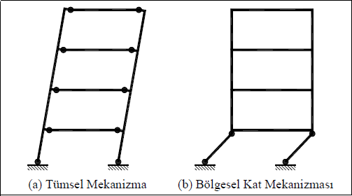 Yukarıdaki görselde (a) tümsel mekanizma hedeflenen sistem iken (b) bölgesel kat mekanizması istenmez. (b) de görüldüğü gibi mafsallar kolon uçlarında oluşmuş durumda bu gevrek göçmeye sebebiyet veren bir durumdur.