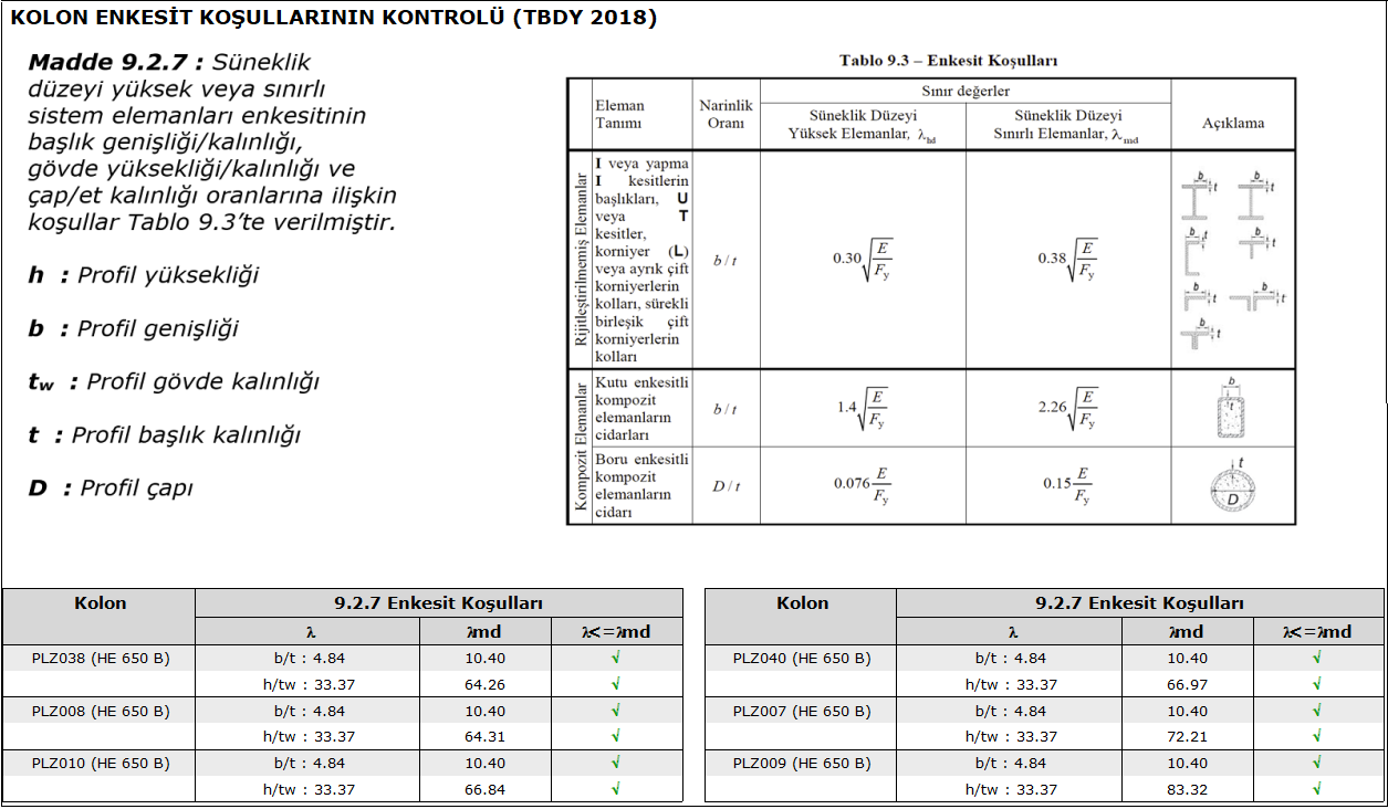Süneklik düzeyi sınırlı moment aktaran çerçeve elemanı olan çelik kolon ve kirişlerin enkesitleri Tablo 9.3’e göre kontrol edilir ve ilgili eleman raporlarında yer alır.