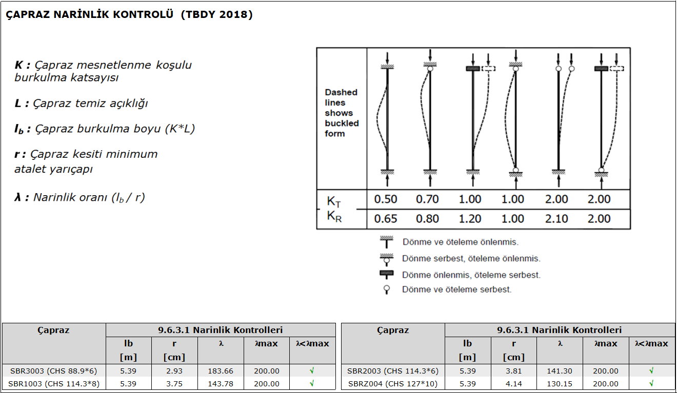 Süneklik düzeyi yüksek merkezi çaprazlı çerçeve elemanı olan çaprazların narinlik oranı otomatik kontrol edilerek raporlanır.