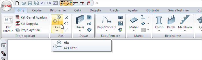 Aks komutu ile projede akslar pratik şekilde oluşturulur. Farenin sol tuşu tıklanarak ya da ilk aks oluşturulduktan sonra kopyalama veya aks ofset komutu kullanılarak diğer akslar oluşturulur.