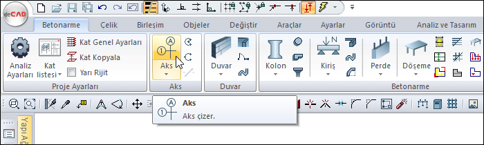 Ribbon menü Betonarme sekmesi Aks başlığı altından ulaşabilirsiniz.