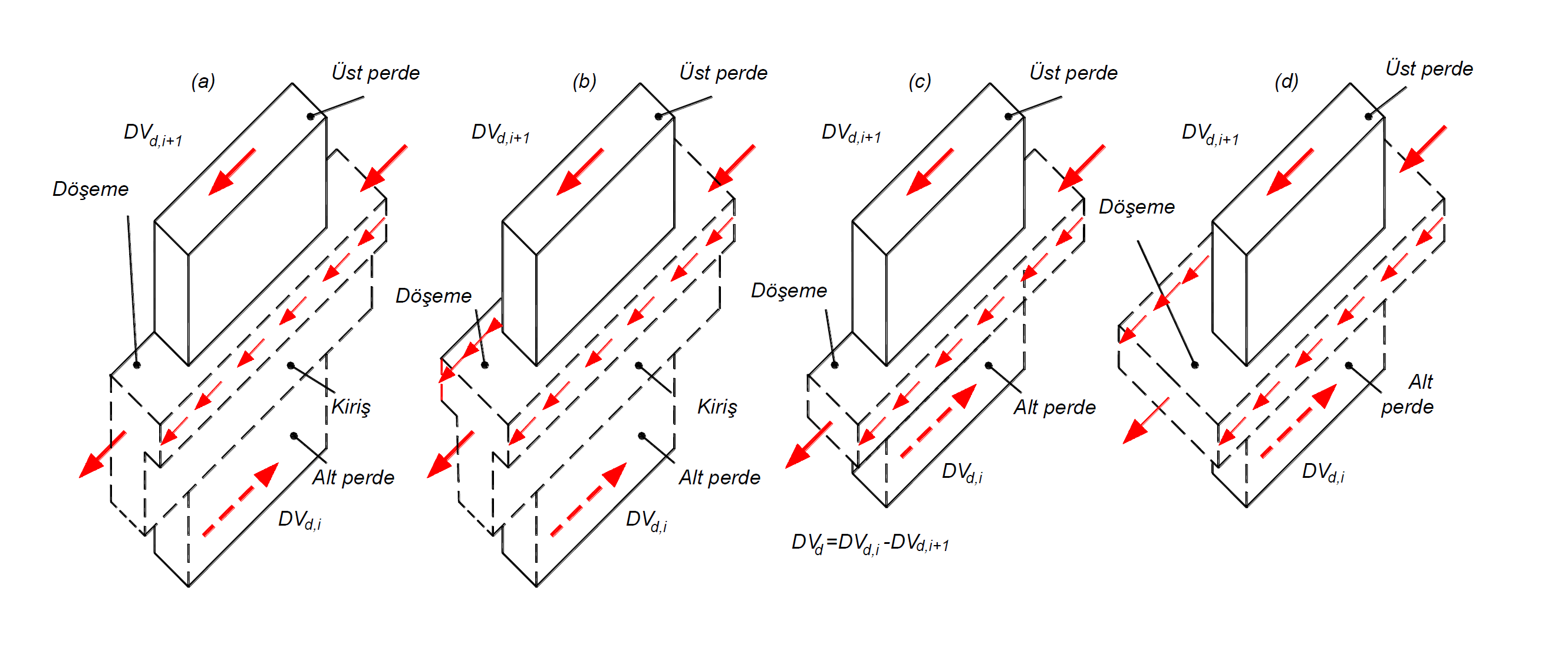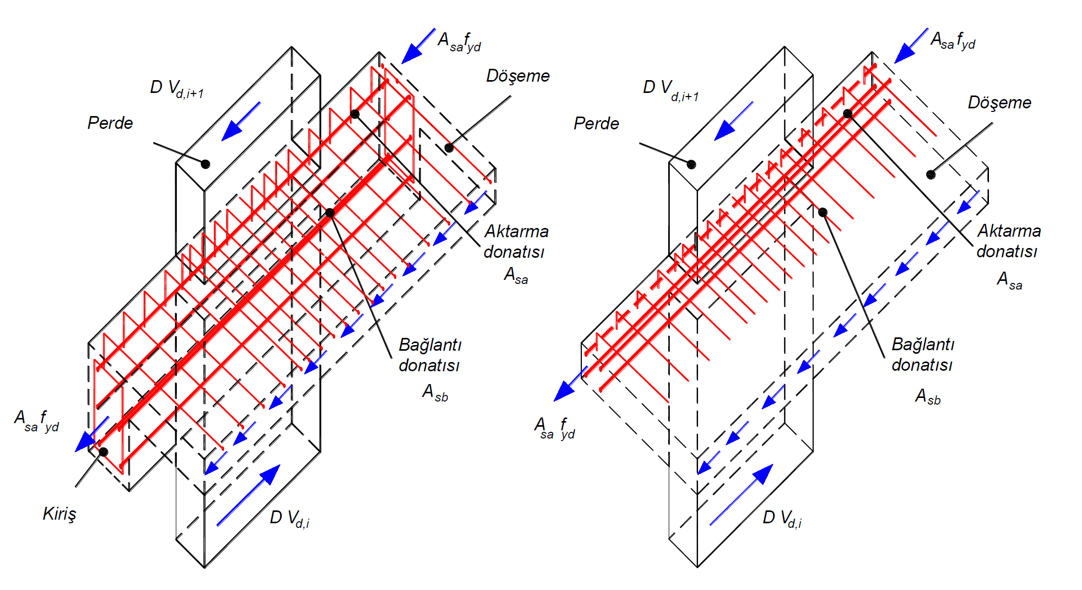 Yukarıdaki resimde perdeye çeşitli şekillerde bağlanmış kirişli döşeme ve kirişsiz döşemeli sistemlerin, perdelere kuvvetli doğrultuda aktardıkları kesme kuvvetlerini gösteren serbest cisim diyagramları gösterilmiştir. DVd,i kat seviyesinin altındaki perdenin üst kesitinde oluşan, düşey yükler ile beraber Dayanım Fazlalığı Katsayısı D ile büyütülmüş olan deprem etkileri altında oluşan kesme kuvveti ve DVd,i+1 kat seviyesinin üstündeki perdenin alt kesitinde oluşan, düşey yükler ile beraber Dayanım Fazlalığı Katsayısı D ile büyütülmüş olan deprem etkileri altında oluşan kesme kuvvetini ifade etmektedir. Burada deprem yüklerinden dolayı oluşan ve döşemeden perdelere aktarılacak olan kesme kuvveti, (DVd) döşeme seviyesinin üstündeki ve altındaki perdelerin kesme kuvvetlerinin farkı (DVd,i+1 - DVd,i) olarak hesaplanmaktadır. Bu kesme kuvveti farkı döşeme içerisinde bulunan, perde düzlemine dik bir şekilde yerleştirilmiş ve perdeye saplanan bağlantı donatıları, Asb ile döşemeden veya kirişlerden perde düzlemine paralel ve perdeye kuvvetli doğrultuda saplanan aktarma donatıları Asa ile karşılanmaktadır. Bu kesme kuvvetleri her yükleme kombinasyonu için bulunmaktadır.