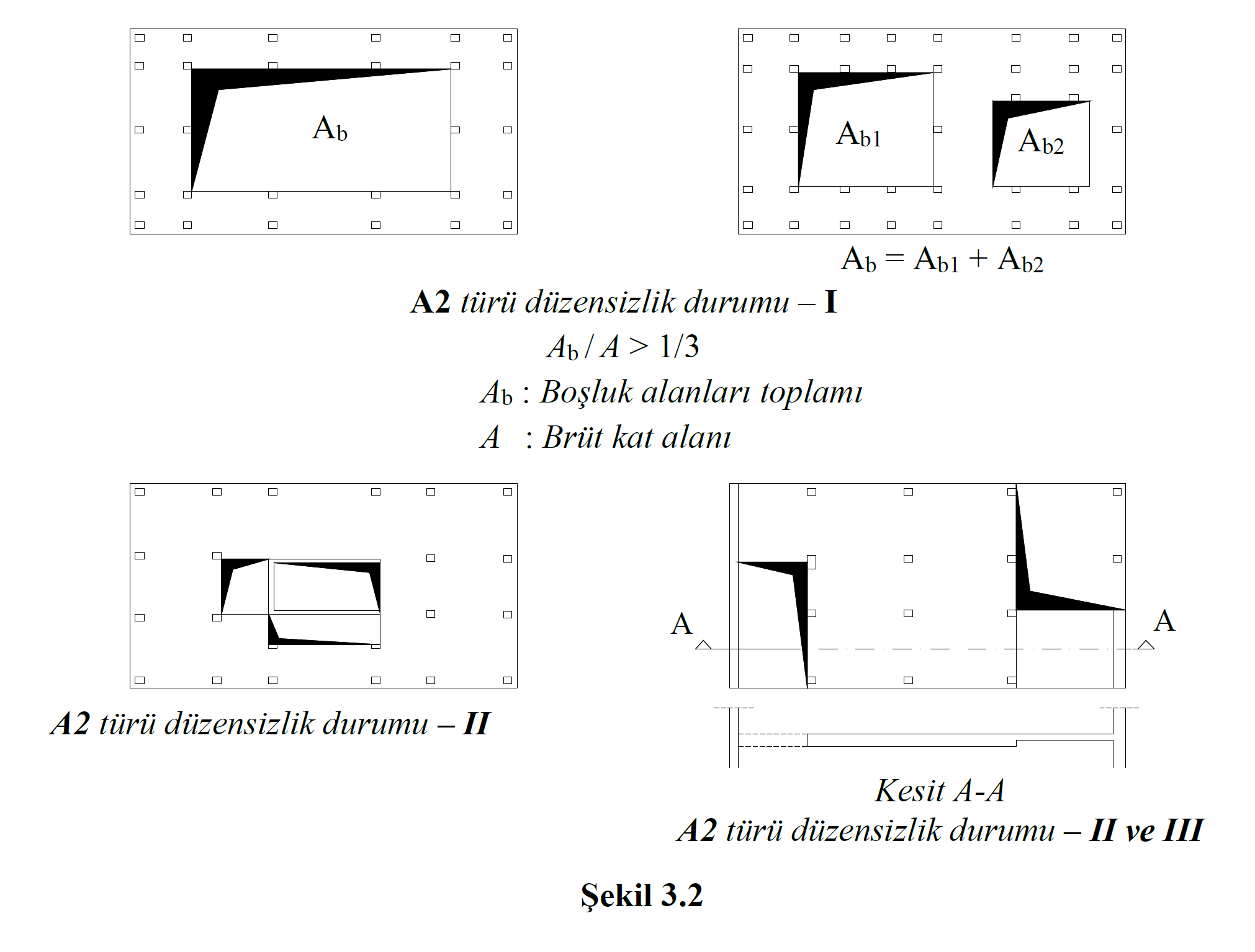 A2 türü düzensizlik durumu TBDY Şekil 3.2 de belirtildiği üzere aşağıdaki üç maddeden herhangi bir tanesinin oluşması durumunda ortaya çıkar.