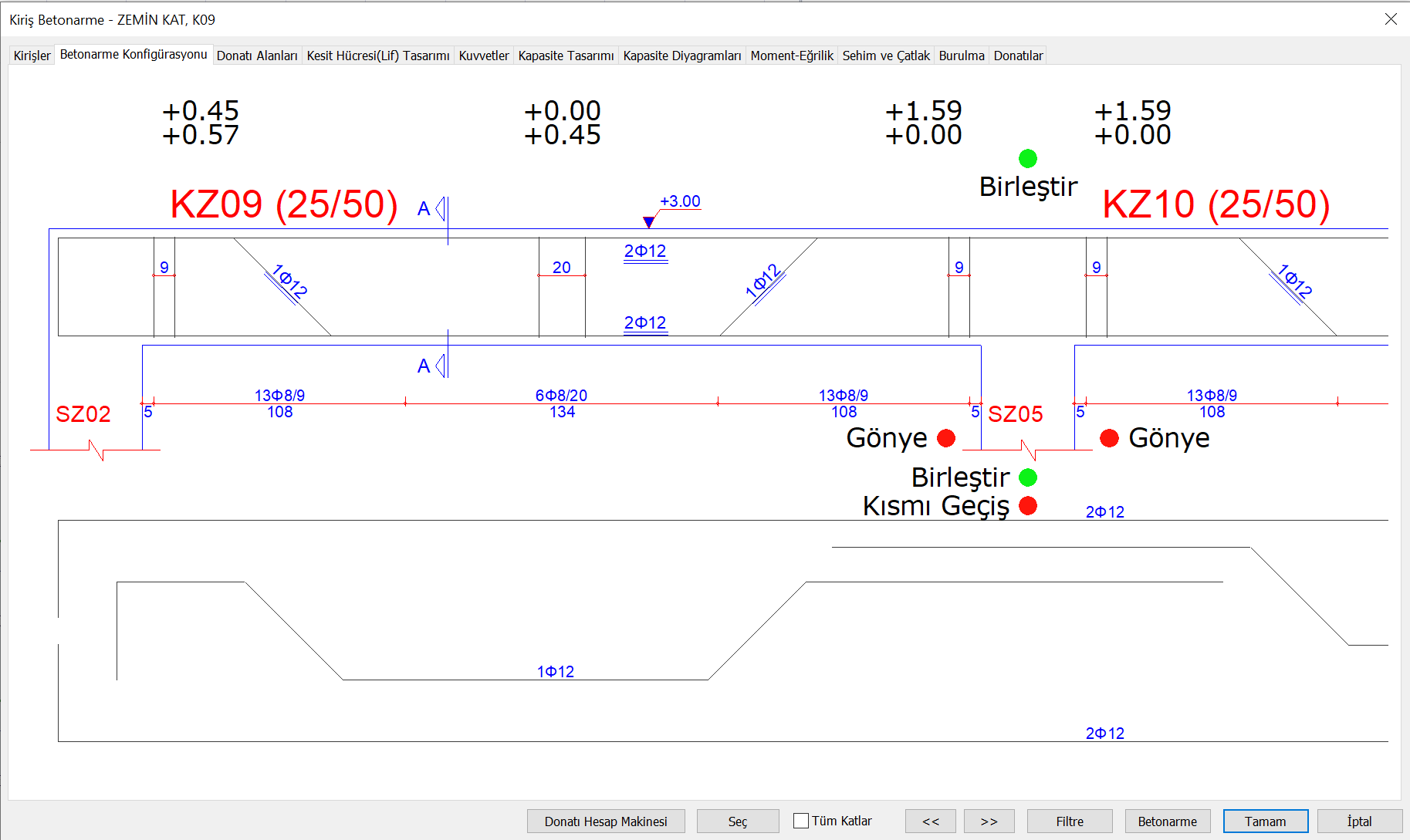 Aşağıdaki resimde örnek bir kirişte gösterilen donatı yerleşimi bulunmaktadır. Burada i ucu, j ucu ve açıklık bölgelerinde bindirme boyunu sağlamayan donatılar moment eğrilikte dikkate alınmamaktadır.