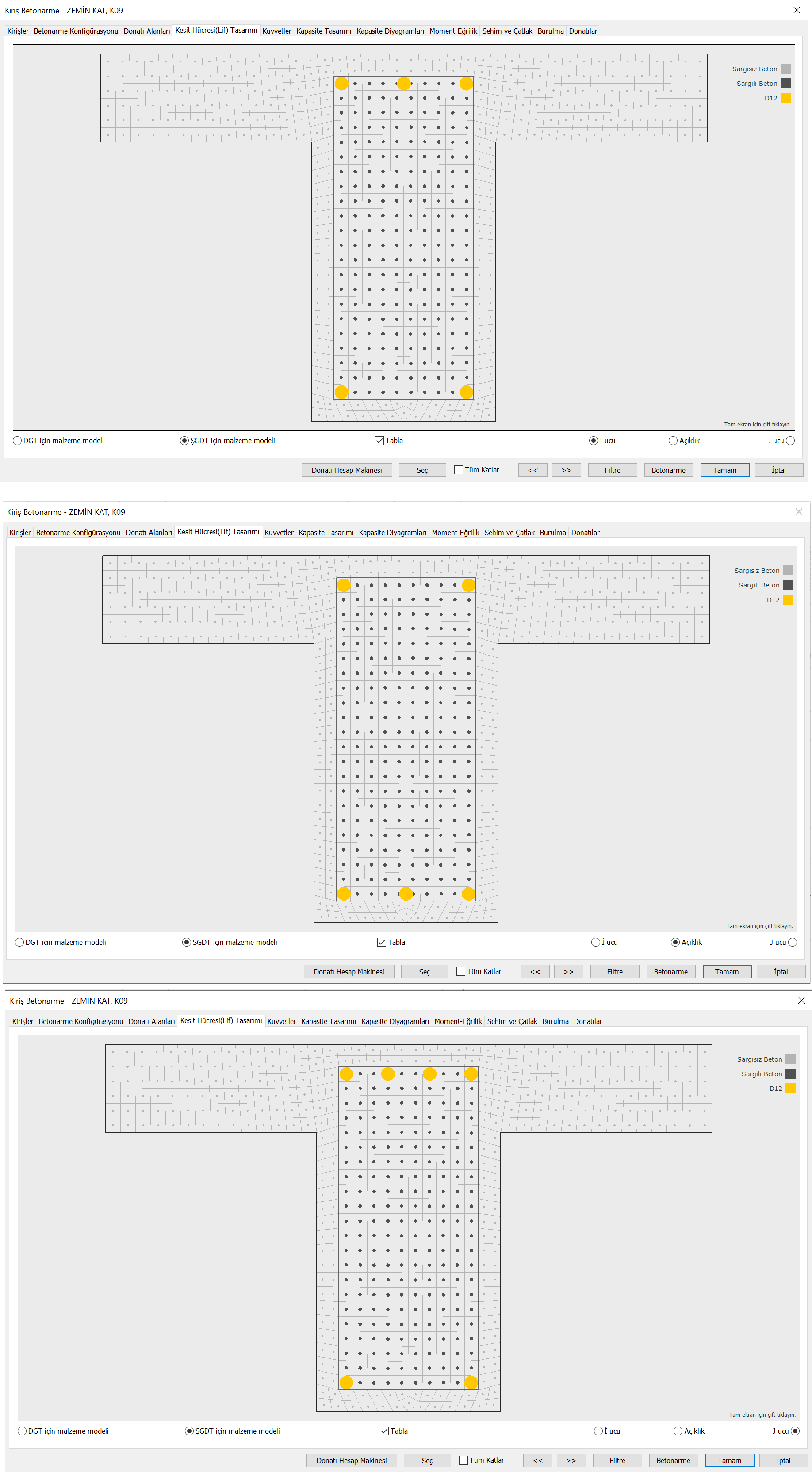 Aşağıdaki resimde donatı yerleşimi verilen kiriş için i ucu, açıklık ve j ucundaki moment eğrilik analizinde kullanılacak olan lif modelleri verilmiştir.