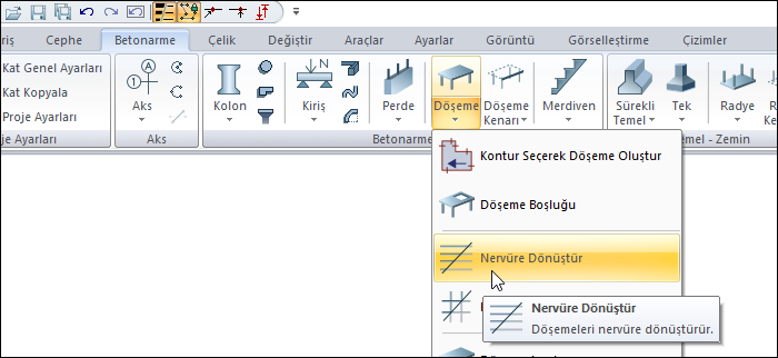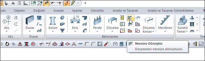 Nervüre Dönüştür komutu ile mevcut betonarme döşemeler nervürlü (tek doğrultuda çalışan dişli döşeme) döşeme haline dönüştürülür. Nervürlü döşemeye dönüştürmek için öncelikle betonarme döşemeler oluşturulmalıdır.