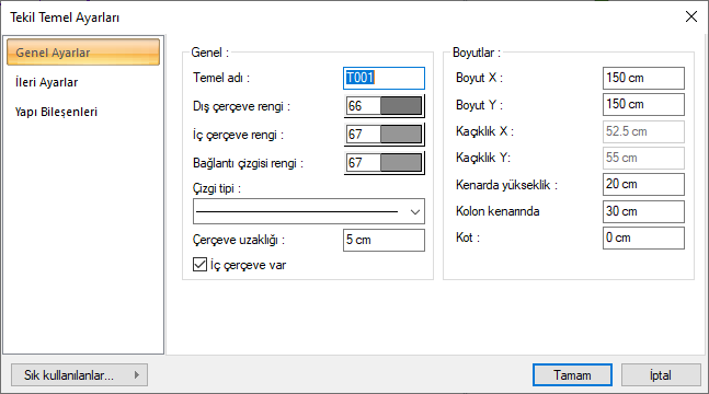 Katı ve adı verilen tekil temellerinin boyutlarının çarpımı en az 1m2’yi sağlamalıdır.