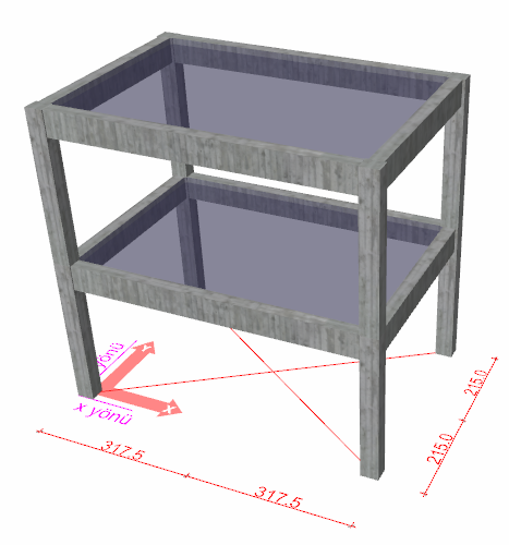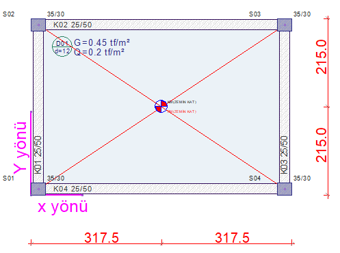 Yapı yükleri ve geometrisi simetrik olduğundan kütle merkezi, geometrik ağırlık merkezi ile aynı değerdedir. Yukarıda ekran görüntüsünde çarpı ile çizilen çizginin kesişiminin uzaklık bilgileri gösterilmiştir.