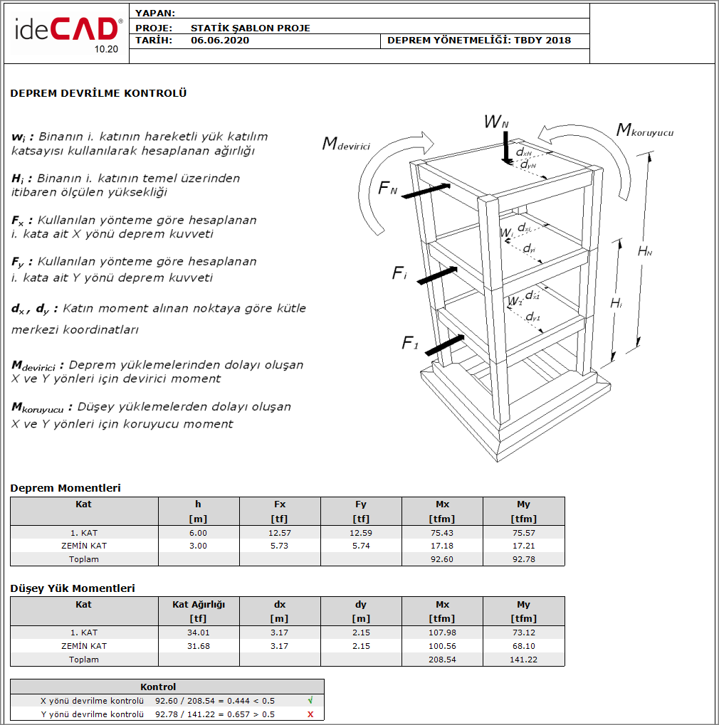 Yapı Devrilme Momenti yatay yüklerin tabanda oluşturduğu moment olarak tanımlanır. Yapı Devrilme Momenti kontrolü, yapıyı devirici momentlerin toplamının, devrilmeyi önleyici momentlerin toplamına oranının 0.5’den büyük olması kontrolüdür.