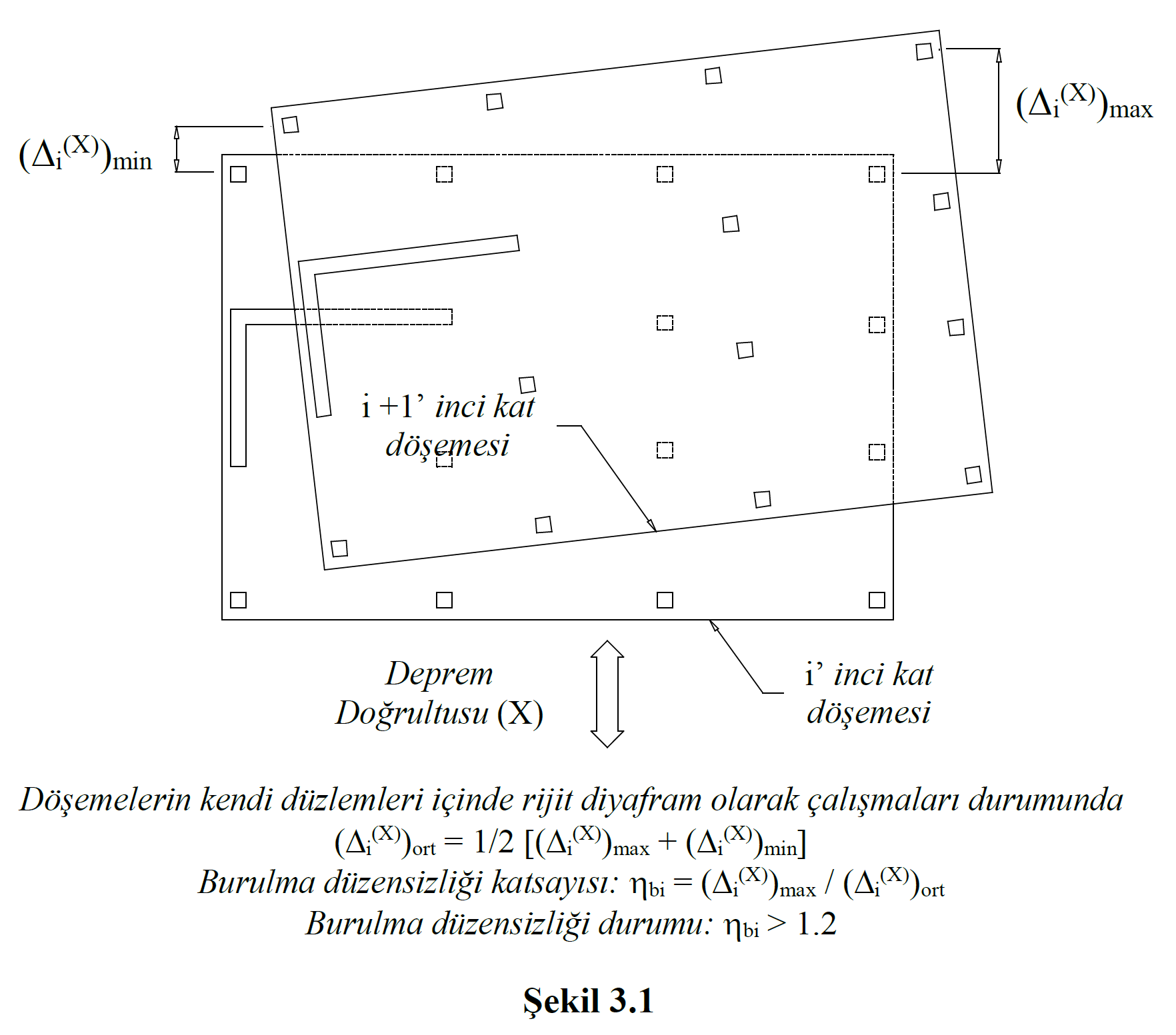 A1 – Burulma Düzensizliği: Birbirine dik iki deprem doğrultusunun herhangi biri için, herhangi bir katta en büyük göreli kat ötelemesinin o katta aynı doğrultudaki ortalama göreli ötelemeye oranını ifade eden Burulma Düzensizliği Katsayısı ηbi ’nin 1.2’den büyük olması durumu (Şekil 3.1).