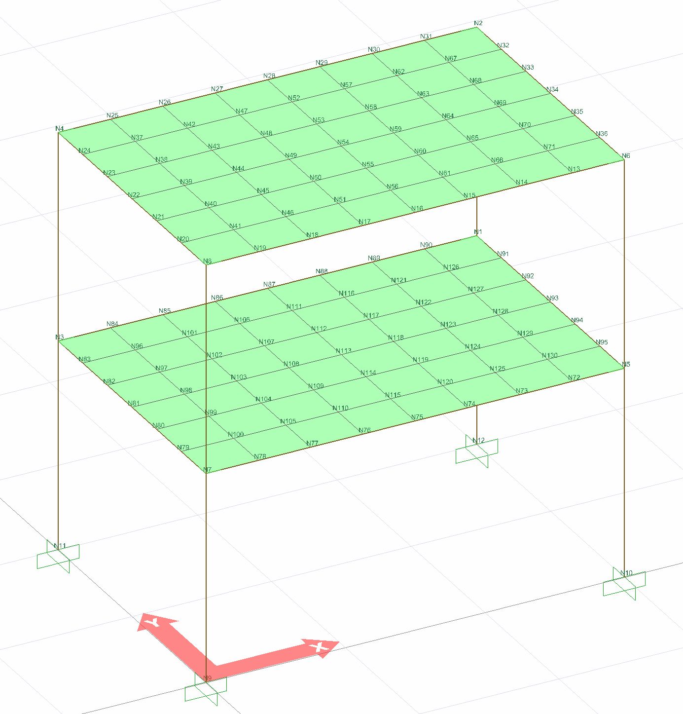 TBDY Madde 3.6.2.2 ve 4.5.6.2 'ye göre A2 ve A3 türü düzensizliklerin bulunduğu binalarda döşemeler iki boyutlu sonlu elemanlar ile modellenir. Aşağıdaki resimde döşemeleri iki boyutlu sonlu elemanlar (shell) ile modellenmiş bir örneğin analiz modeli gözükmektedir.