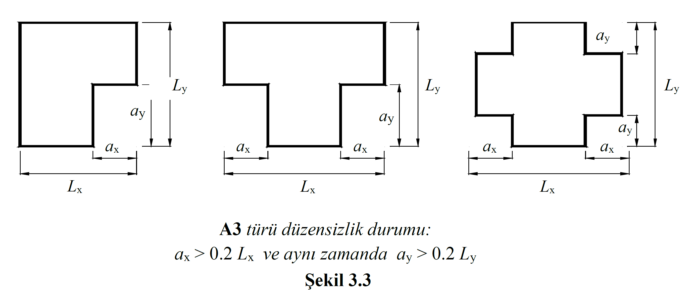 A3 türü düzensizlik durumu TBDY Tablo 3.6 'da belirtildiği üzere bina kat planında çıkıntı yapan kısımların birbirine dik doğrultulardaki boyutlarının her ikisinin de, binanın aynı doğrultudaki toplam botunun %20 'sinden daha büyük olması durumunda ortaya çıkmaktadır. TBDY Şekil 3.3 'de bu durum gösterilmiştir.