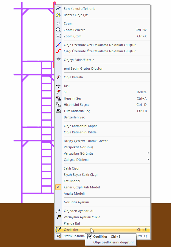 Açıklık genişliğini değiştirmek istediğiniz iskeleyi seçin ve farenin sağ tuşuna tıklayın. Açılan sağ tuş menüden Özellikler satırını tıklayın.