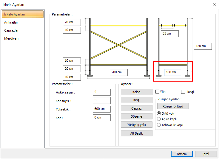 Açıklık genişlik ayarları ile iskele açıklıklarının genişlikleri belirlenir. Açıklık genişlik ayarlarına iskele ayarları diyaloğu iskele ayarları sekmesinden ulaşılır.