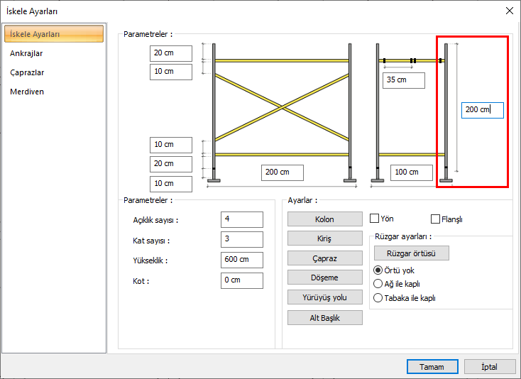Girdiğiniz açıklık yüksekliğinize göre iskele yüksekliğiniz program tarafından hesaplanıp otomatik olarak güncellenecektir.