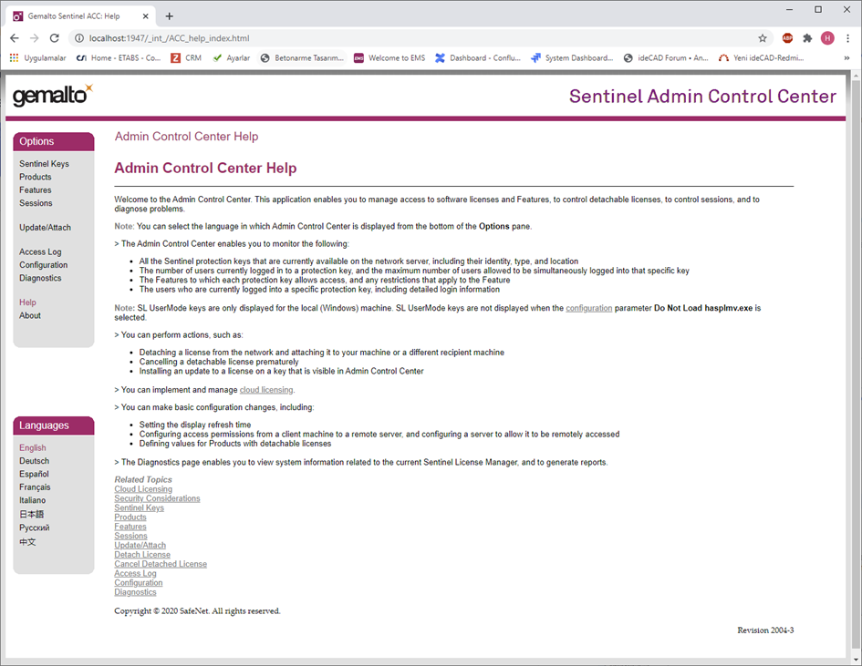 Sentinel Yönetici Kontrol Merkezine her makineden http: // localhost: 1947 / adresi ile ulaşabilirsiniz. Aşağıdaki ekran açılacaktır.