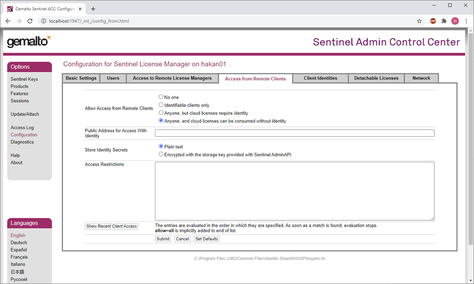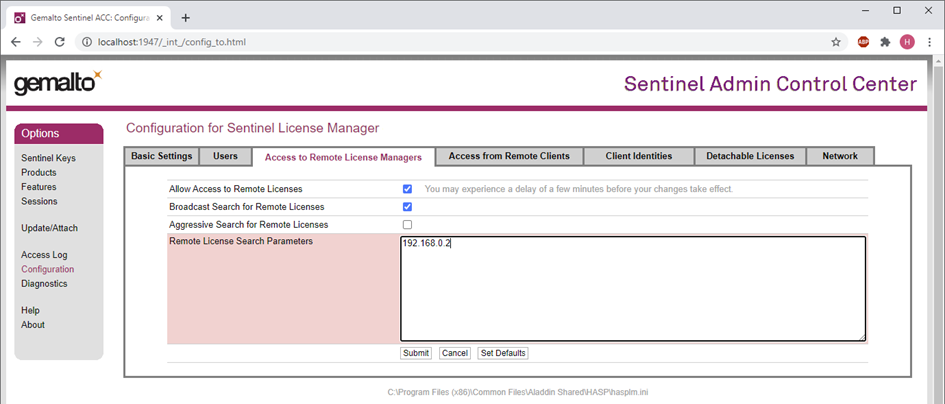 "Configuration" menüsü altında, "Access to Remote License Managers" öğesini seçin ve dongle makinesinin IP adresini (bu örnek için 192.168.0.2) yazınız.