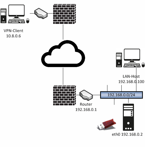Örneğin, 192.168.0.0/24 adresli bir ağda, eğer donanım kilidi 192.168.0.2 adresli bir sunucuya bağlanırsa (aşağıya bakın), aşağıdaki işlemler IP 10.8.0.6 uzak makinede gerçekleştirilecektir.