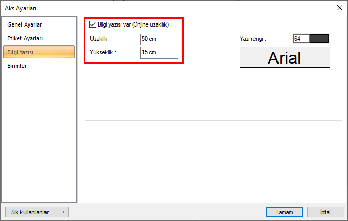 Aks ayarları diyaloğu Bilgi Yazısı sekmesinden ulaşabilirsiniz.