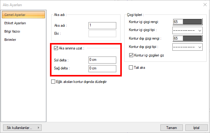 Sol delta ve Sağ delta değerleri ile aksın sol ya da sağ ucu, girilen değer kadar uzar ya da kısalır. Negatif değer, aksın ilgili ucunun kısalacağını, pozitif değer ise uzayacağını belirtir.