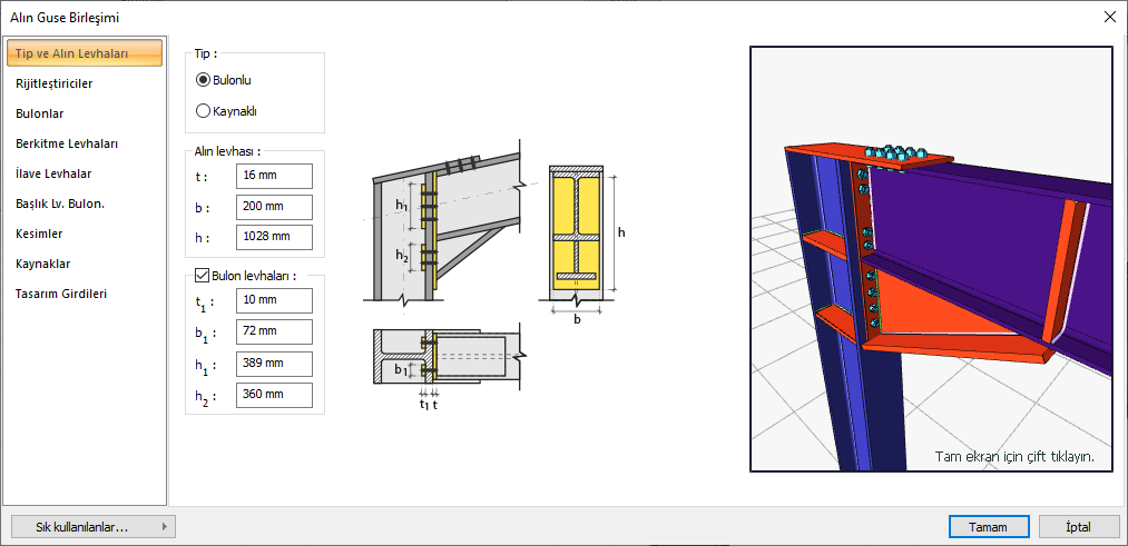 Tip ![]() Bağlantı için bulonlu ya da kaynaklı bağlantı tiplerinden biri seçilir. |