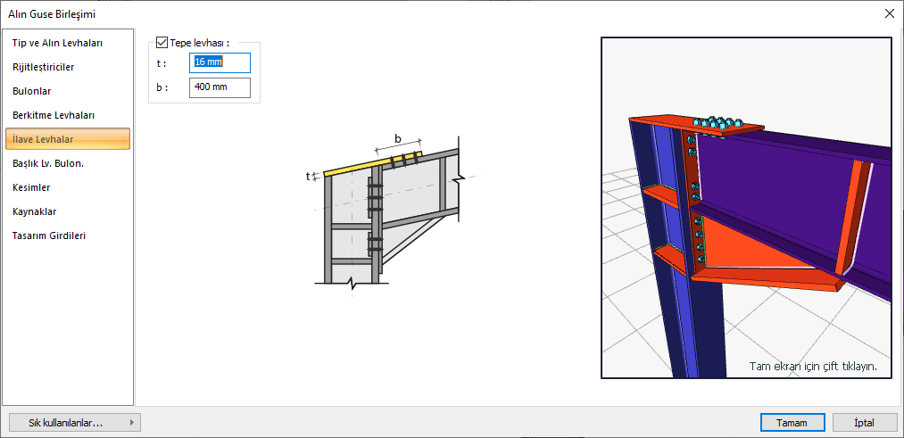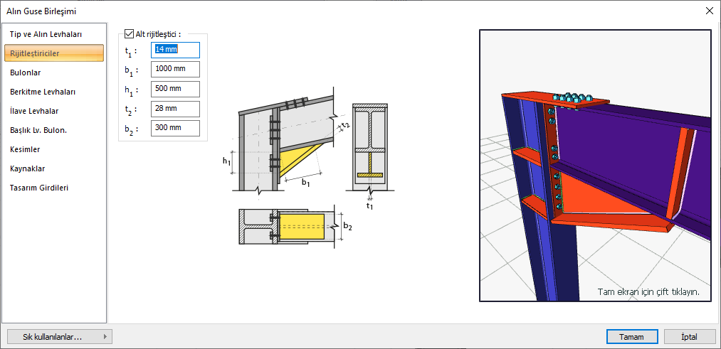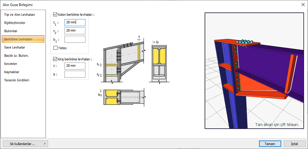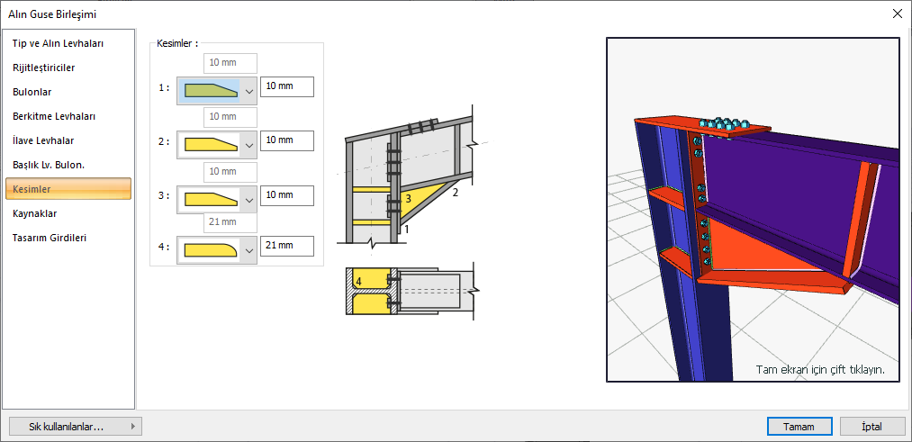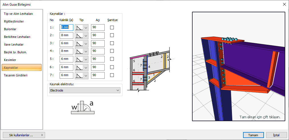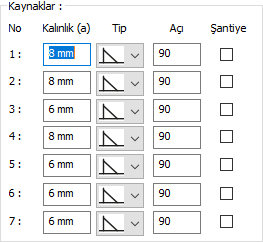 Kaynaklar ![]() Birleşim yerlerine yapılacak kaynakların kalınlık, tip ve açı değerleri verilir. Şantiyede yapılıp yapılmayacağı bilgisi girilir. |