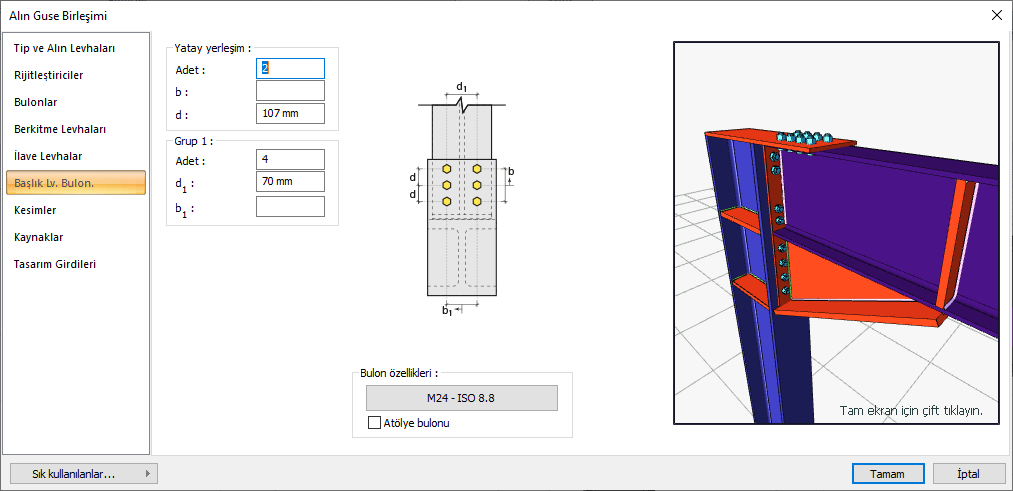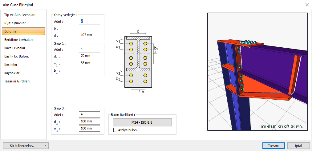 Grup 3 ![]() Bulonları kirişe ve diğer bulonlara uzaklık değerleri girilir. Girilecek değerler şematik çizimde gösterilmektedir. |