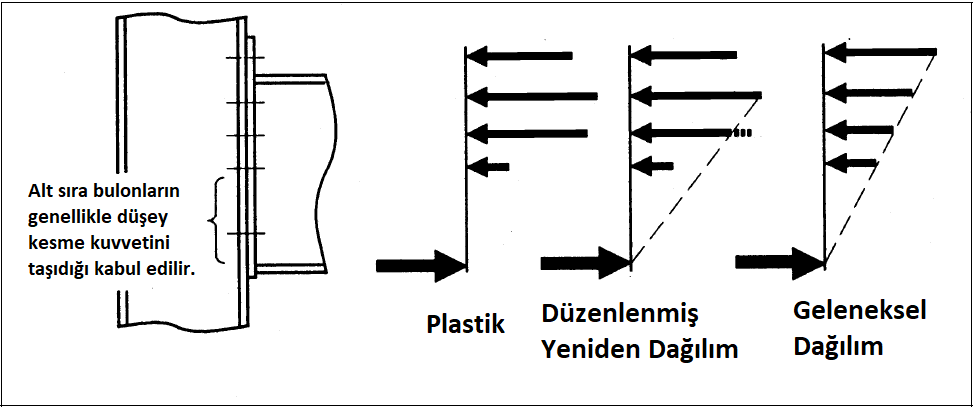 Basınç başlığına en uzak olan bulon sırası en büyük çekme kuvvetine maruz kalan bölge olarak kabul edilir ve ters üçgen kuvvet dağılımı hesap kolaylığı açısından kabul edilirken ve söz konusu sünek bir birleşim ise plastik kuvvet dağılımı kabulüne göre parabolik bir dağılım üzerinden hesap yapılır.