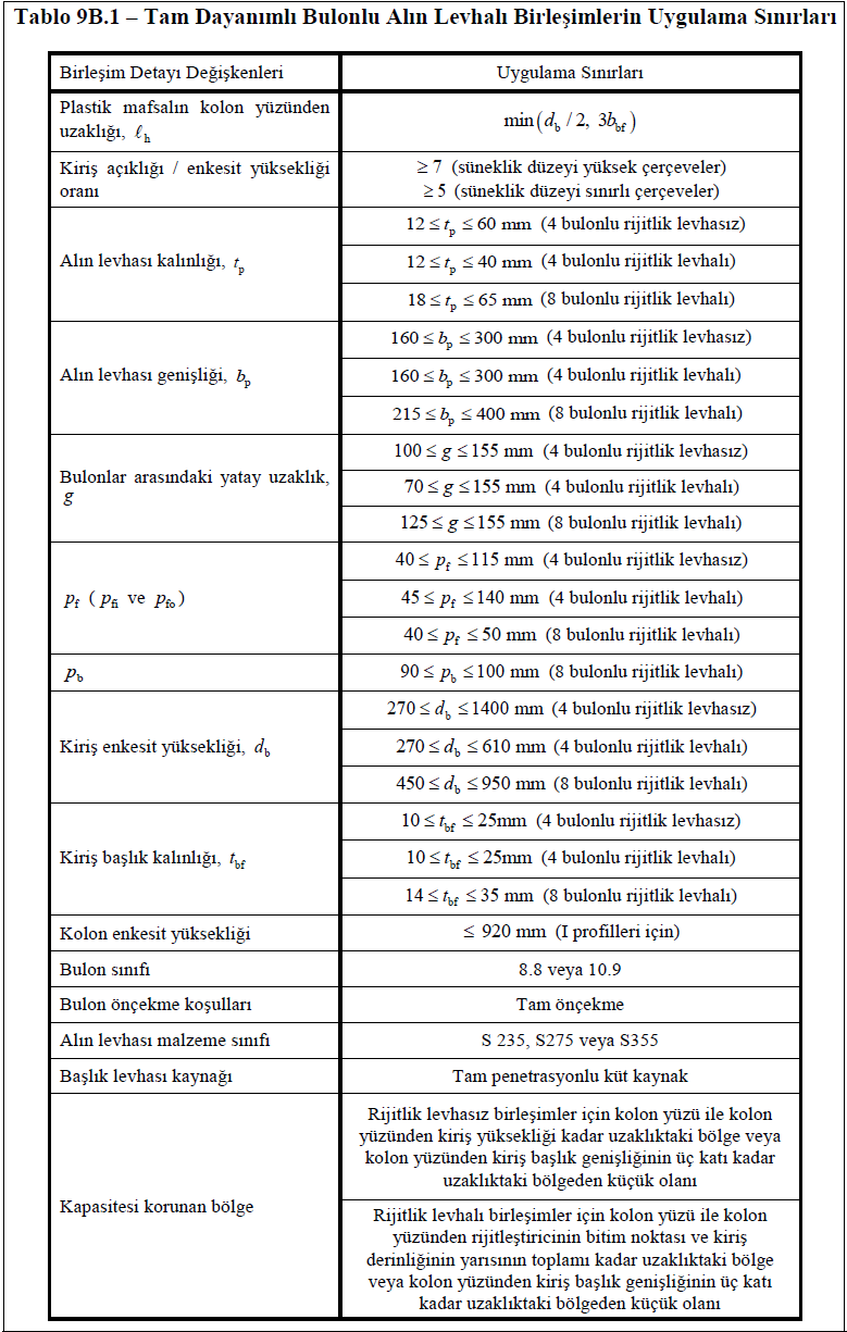 Alın levhalı birleşimlerde, plastik mafsal birleşen kiriş ve kolon panel bölgesinde elastik ötesi eğilme deformasyonlarına neden olur. Bu nedenle güçlü kolon, güçlü birleşim ve zayıf kiriş tasarımı felsefe olarak kabul edilir. Bu nedenle aşağıda verilen tabloda plastik mafsalın boyu, kolon yüzünden uzaklığı, özellikle kontrol edilir.