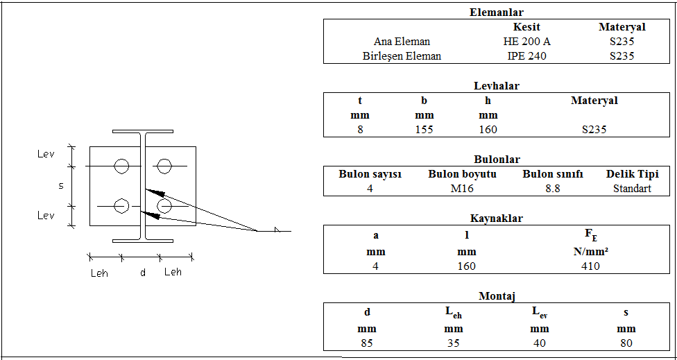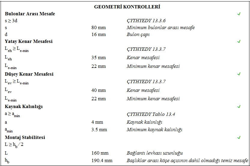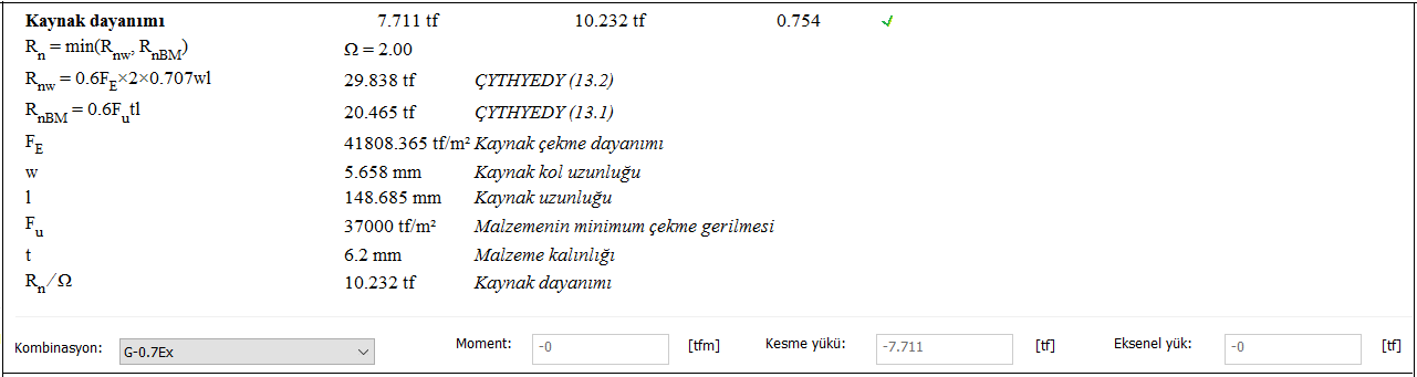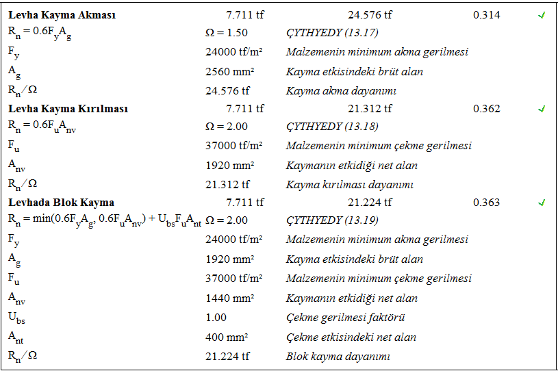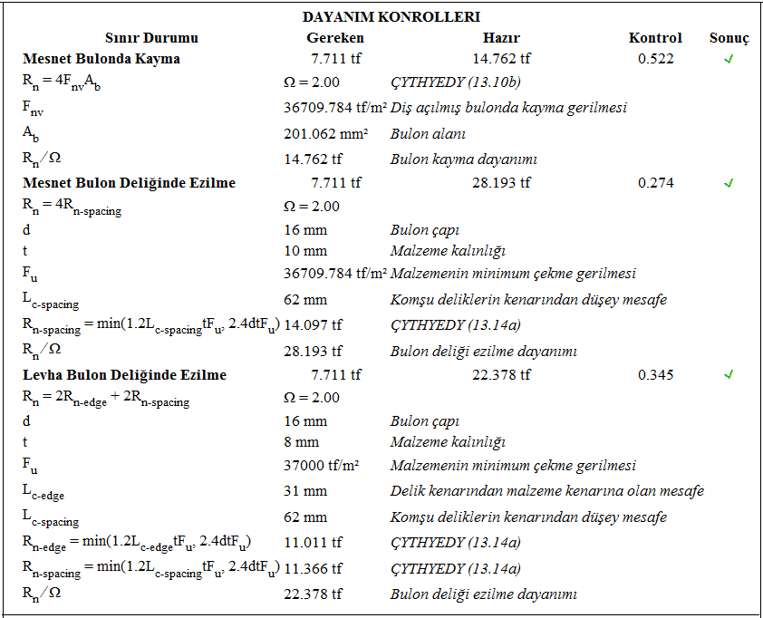 Alın levhalı kayma birleşimi raporunda Çelik Yapıların Tasarım, Hesap ve Yapım Esasları (ÇYTHYEDY) (GKT ve YDKT) veya AISC 360-16 (ASD ve LRFD) yönetmeliklerine göre tasarımı yapılan birleşimin kontrolleri verilir.