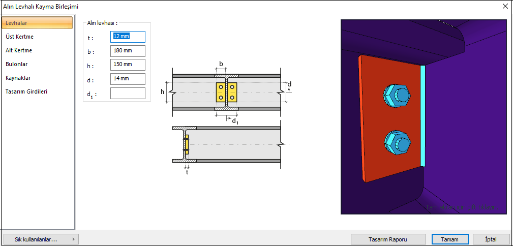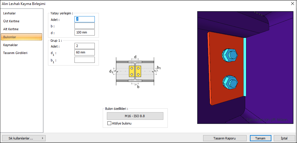 Alın levhalı birleşim, profilin gövdesine kaynakla mesnete bulonla bağlı olan bir moment aktarmayan birleşim (kayma birleşimi) tipidir. Bulon kontrolü, kaynak kontrolü ve levha kontrolü birleşimin elemanlarının yerleşimine göre otomatik yapılır. Tek kayma levhalı birleşim tasarımı Çelik Yapıların Tasarım, Hesap ve Yapım Esasları (ÇYTHYEDY) (GKT ve YDKT) veya AISC 360-16 (ASD ve LRFD) yönetmeliklerine göre otomatik yapılır ve birleşim raporu oluşturulur.
