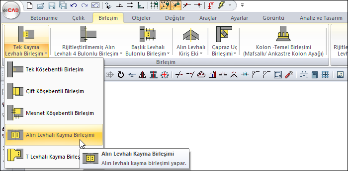Çelik menüsünden Alın Levhalı Kayma Birleşimi satırını tıklayın.