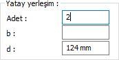 Yatay yerleşim ![]() Bulonların yatay yerleşim ayarları (yatay bulon sütun sayısı, uzaklık değerleri..) girilir. Girilecek değerler şematik çizimde gösterilmektedir. |