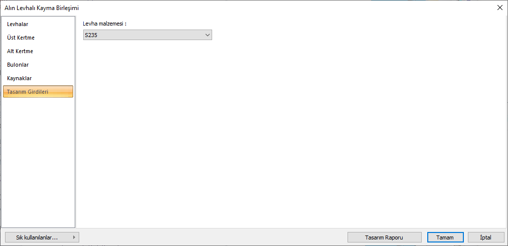 Tasarım girdilerinde levha malzemesi tanımlanır.